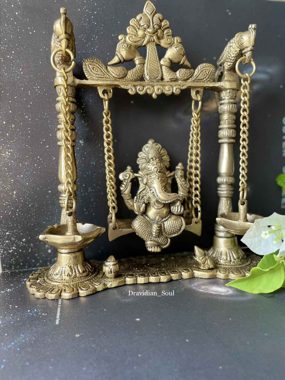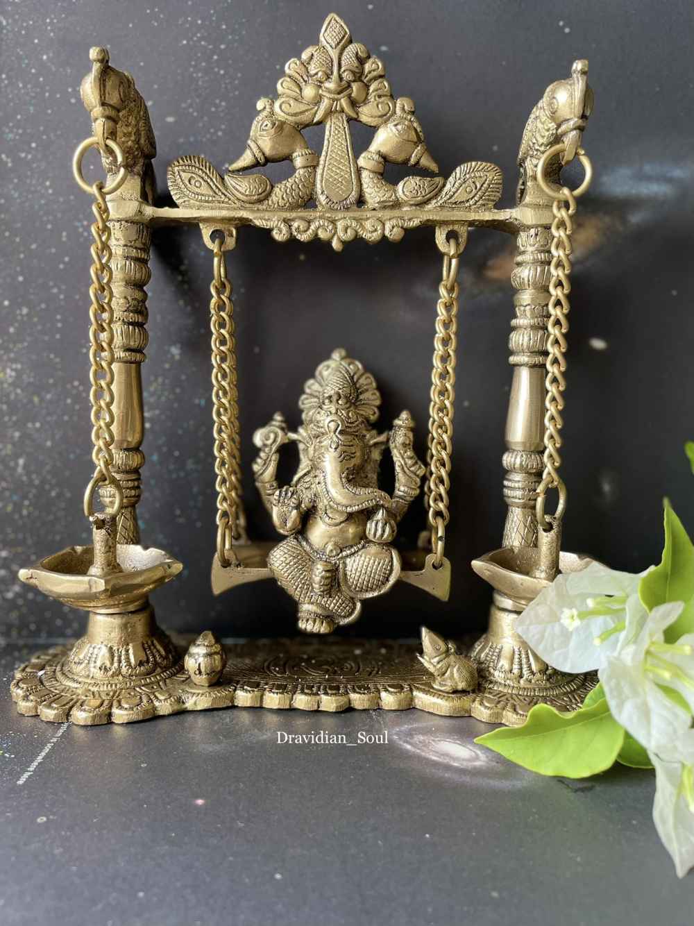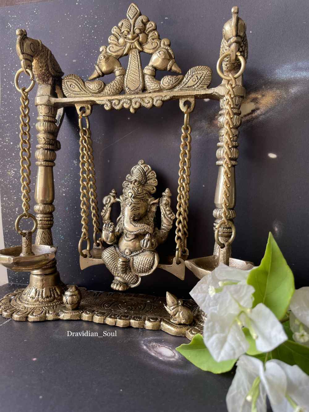 LORD GANESHA BRASS IDOL SITTING ON A JULA/SWING WITH DIYAS Ganesha, also spelled Ganesh, also called Ganapati, elephant-headed Hindu god of beginnings, Ganesha is a remover of obstacles. He is also worshiped as the god of education, knowledge, ... Read More