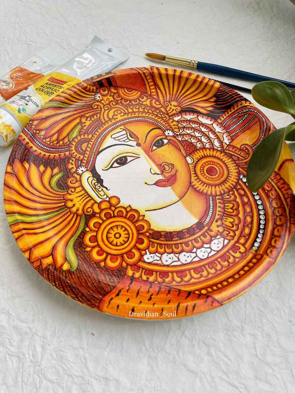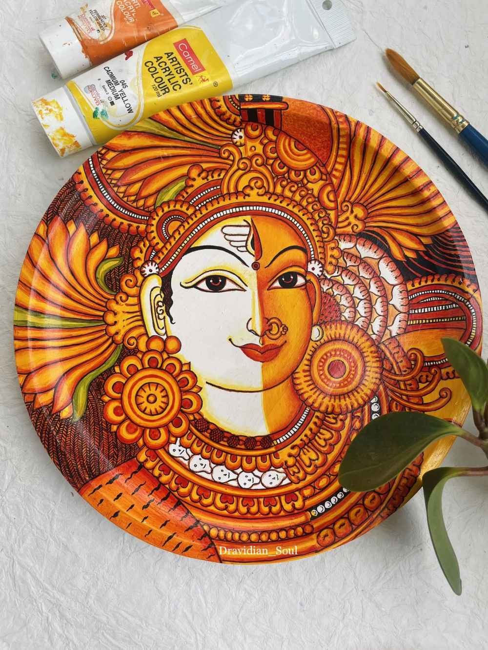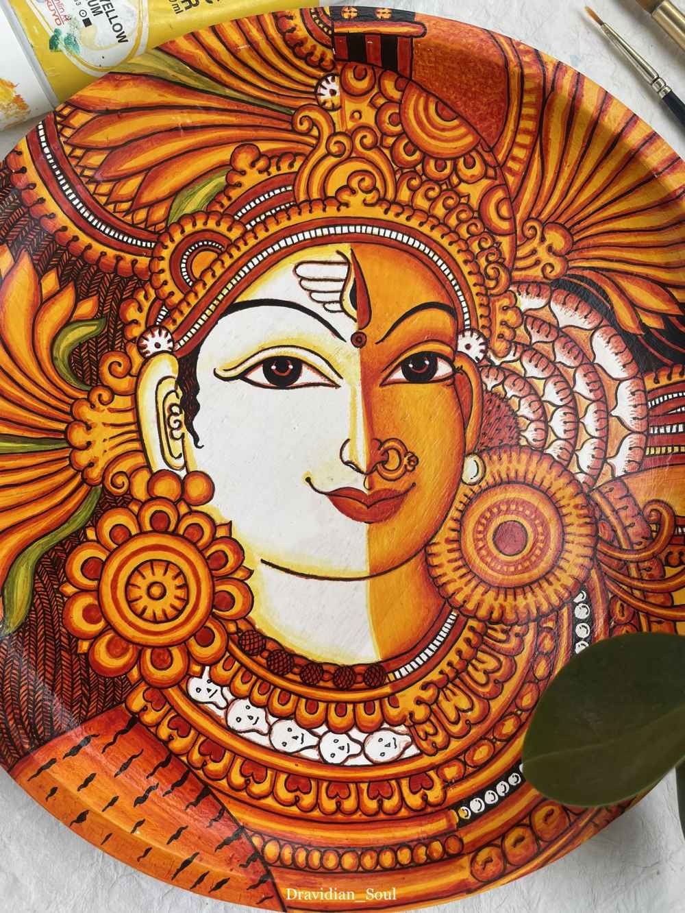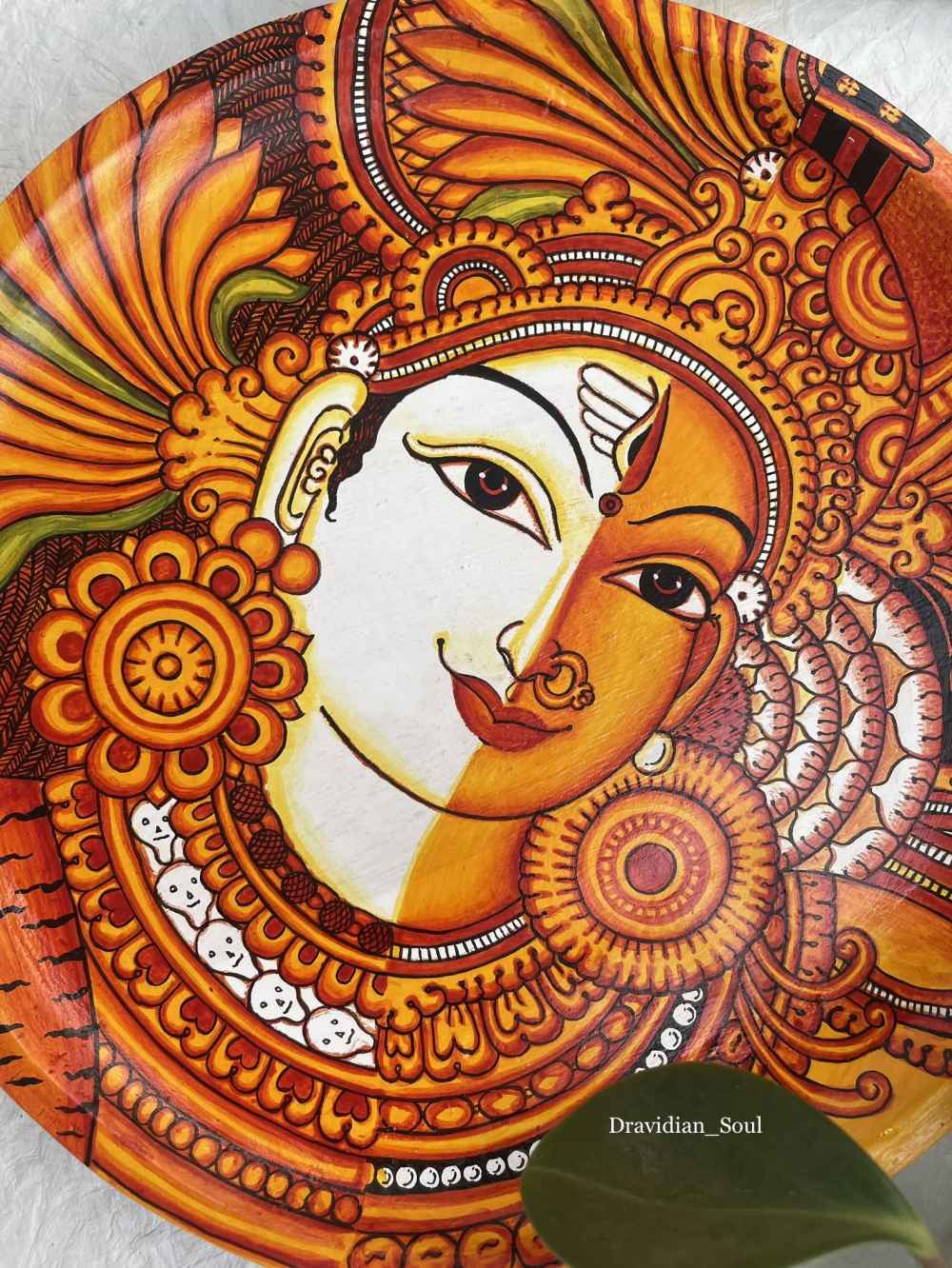 Painted in Kerala mural style painting, among the numerous forms of Shiva, Ardhanarishvara is probably the most unique. It is a form of the Hindu deity Shiva combined with his consort Parvati. Ardhanarishvara is depicted as half-male and ... Read More