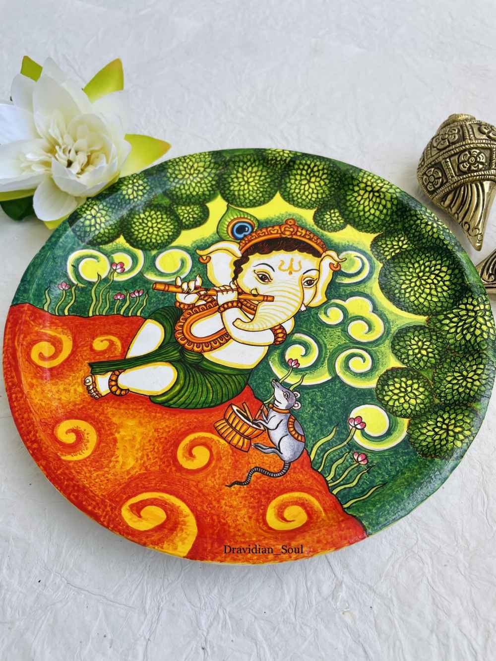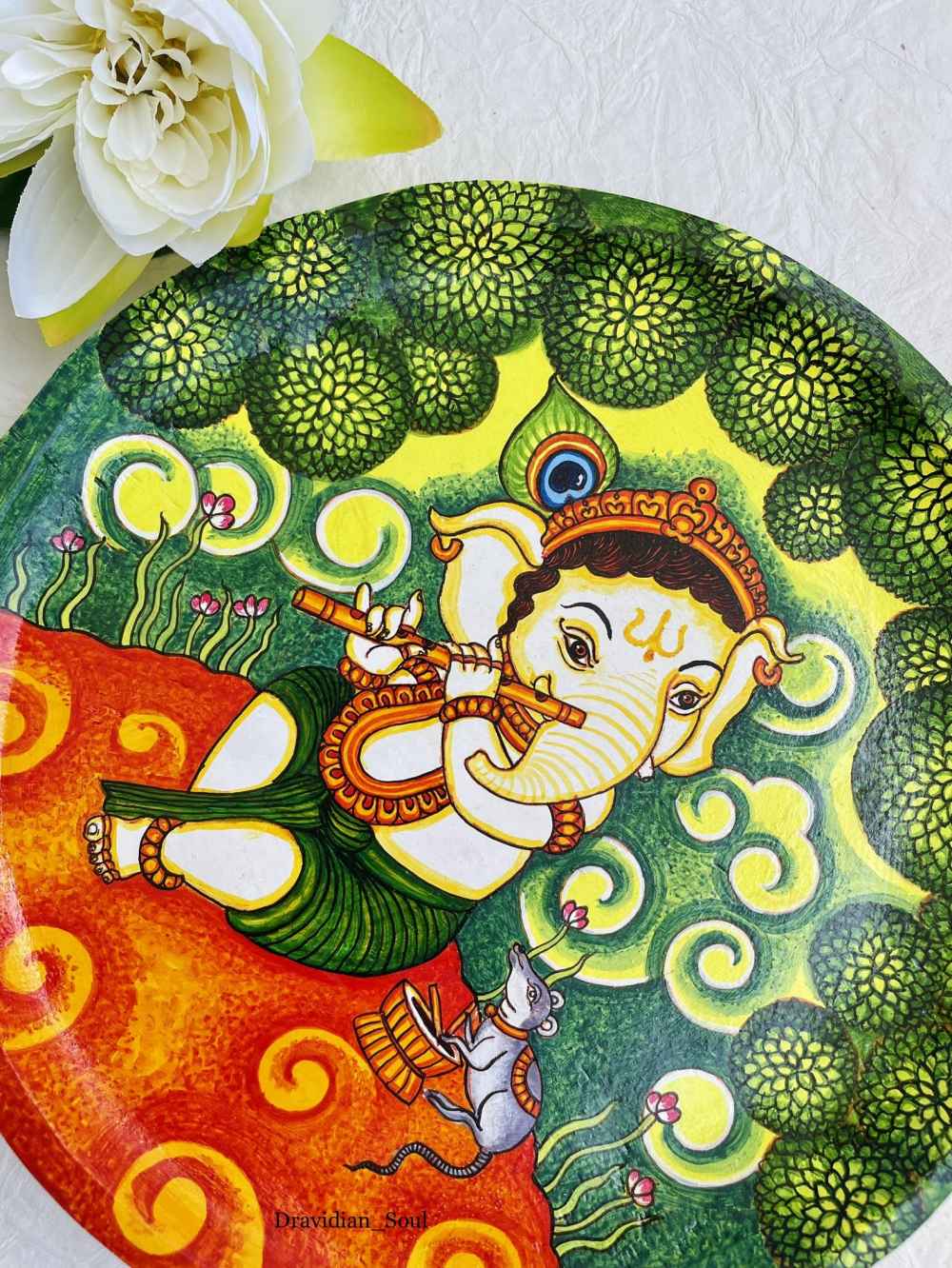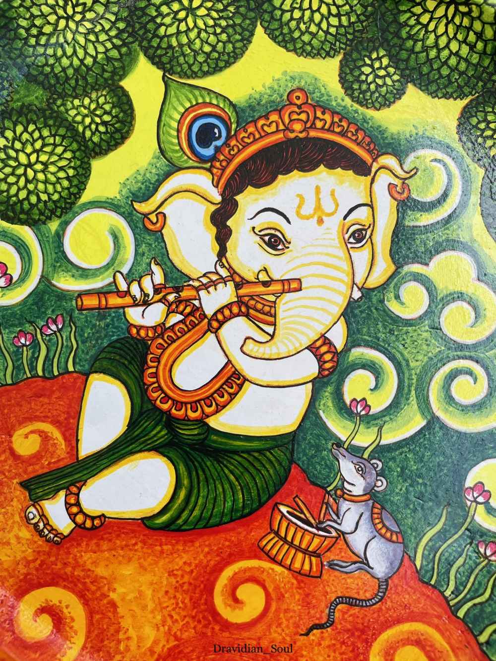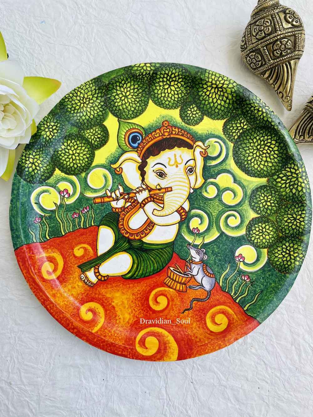 Painted in Kerala mural style painting give your home a traditional & ethnic aesthetics with this beautifully handpainted Ganapati playing the flute & his beloved vahana mooshika playing the drums. Ganesha, also spelled Ganesh, also called Ganapati, ... Read More