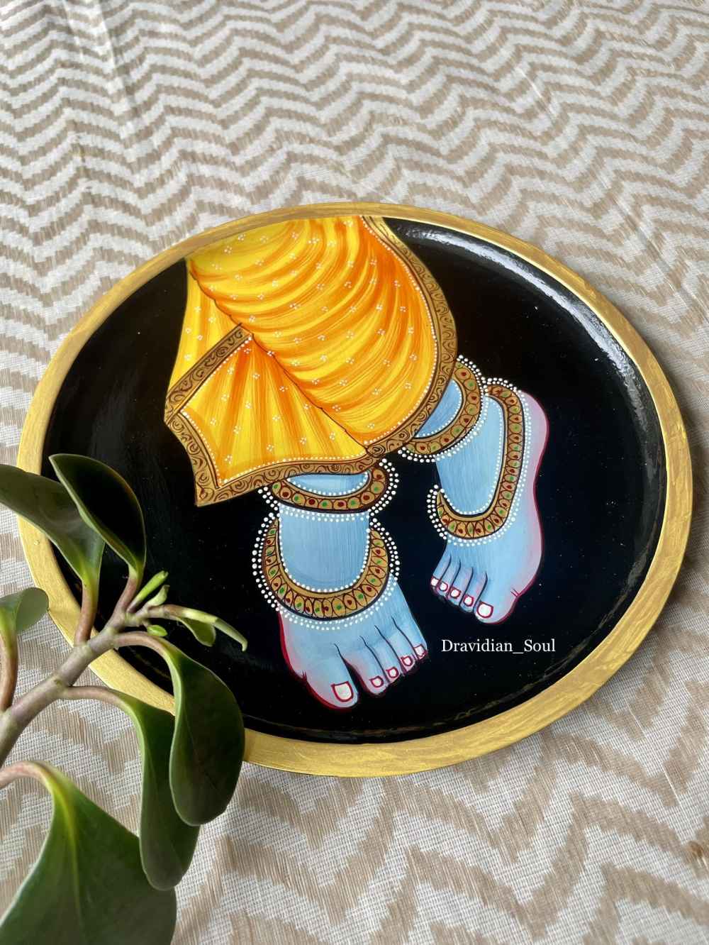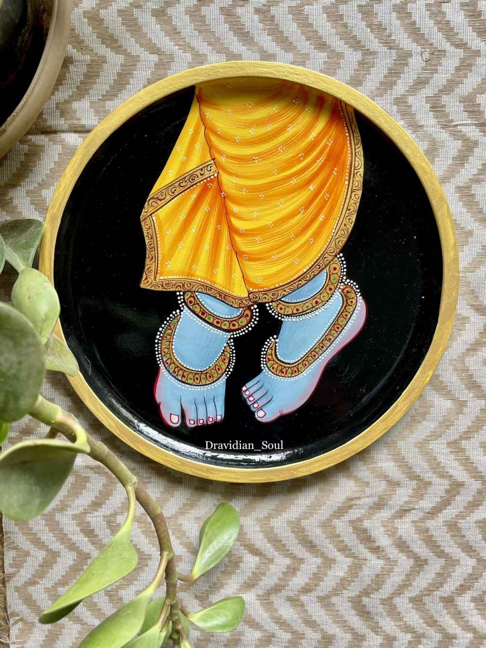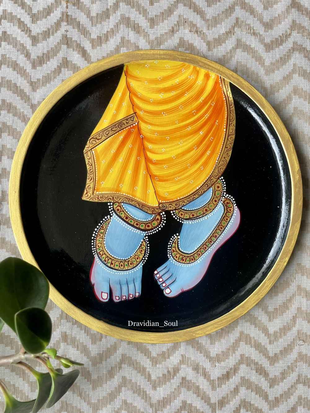 "Give your home a traditional & ethnic aesthetics with this beautifully handpainted Lord Krishna’s feet; You can mix match this unique Wallplate with the various other wall plate options available on our page to curate a stunning statement ... Read More