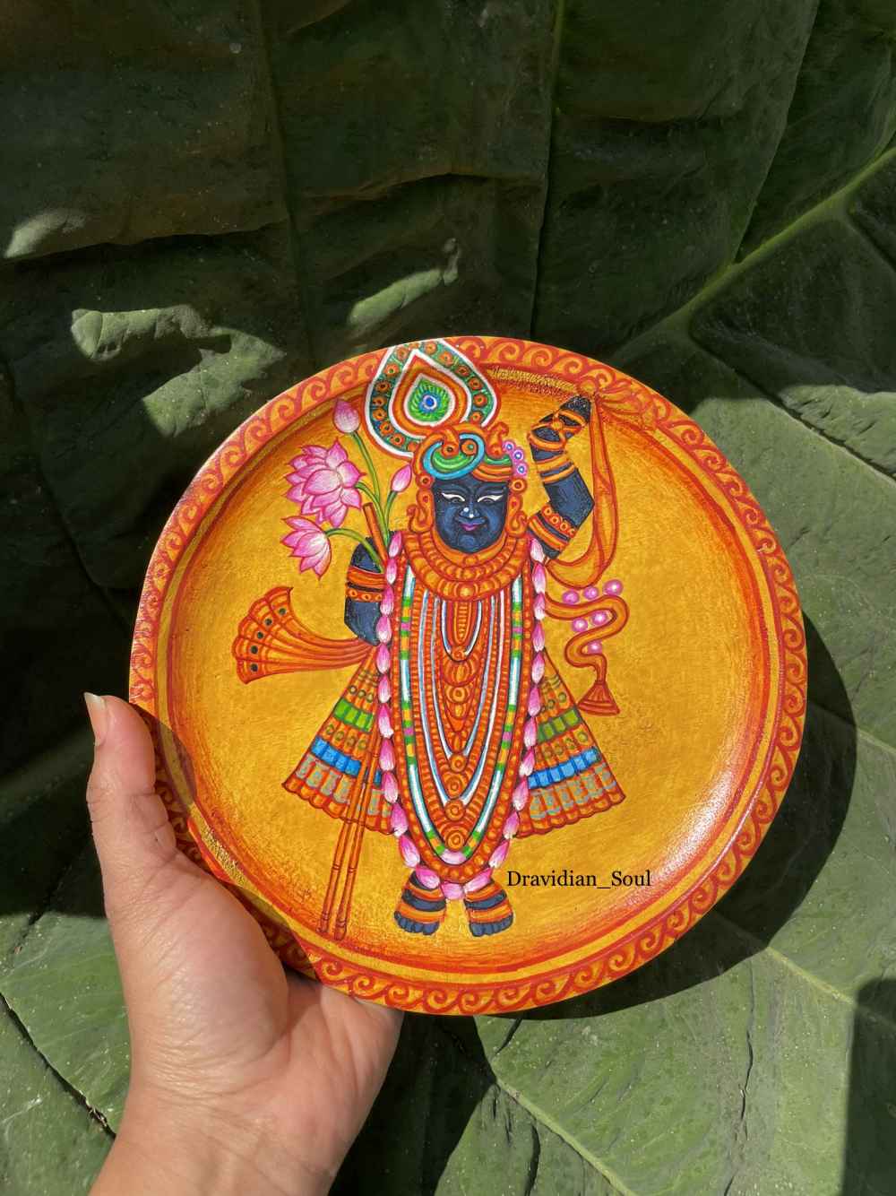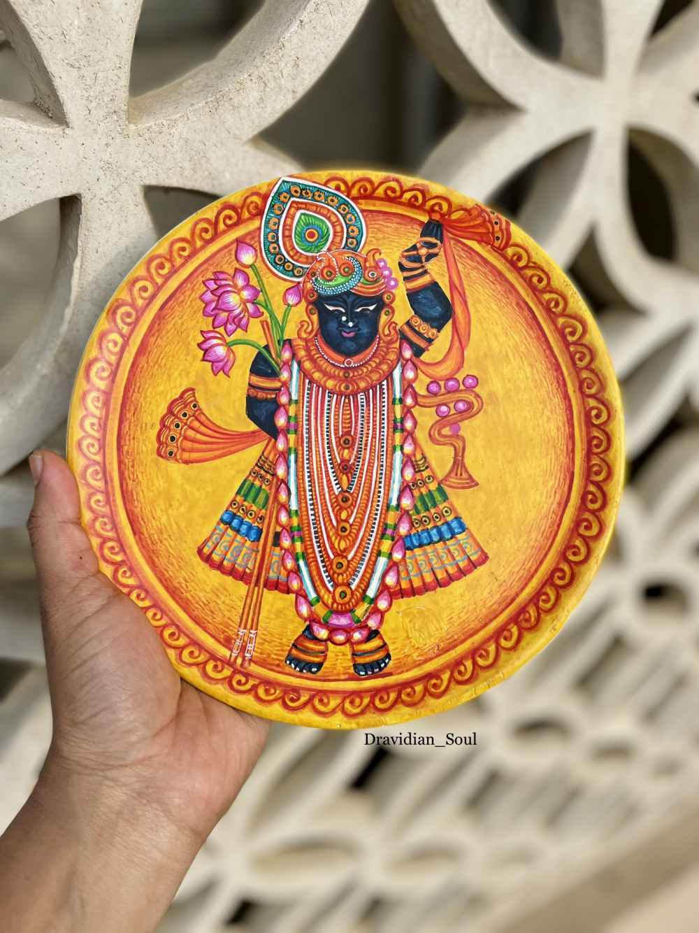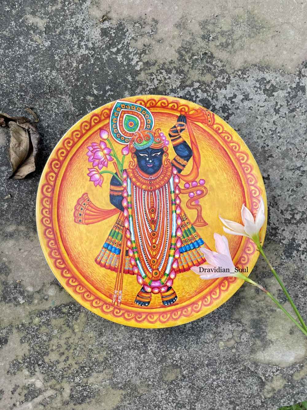 "LORD SHRINATHJI HANDPAINTED WALLPLATE Shrinathji is a form of Krishna, manifested as a seven-year-old balak or child when he lifted the Govardhana giri, with one arm raised. The image is depicted in the form of a single black marble idol, where ... Read More