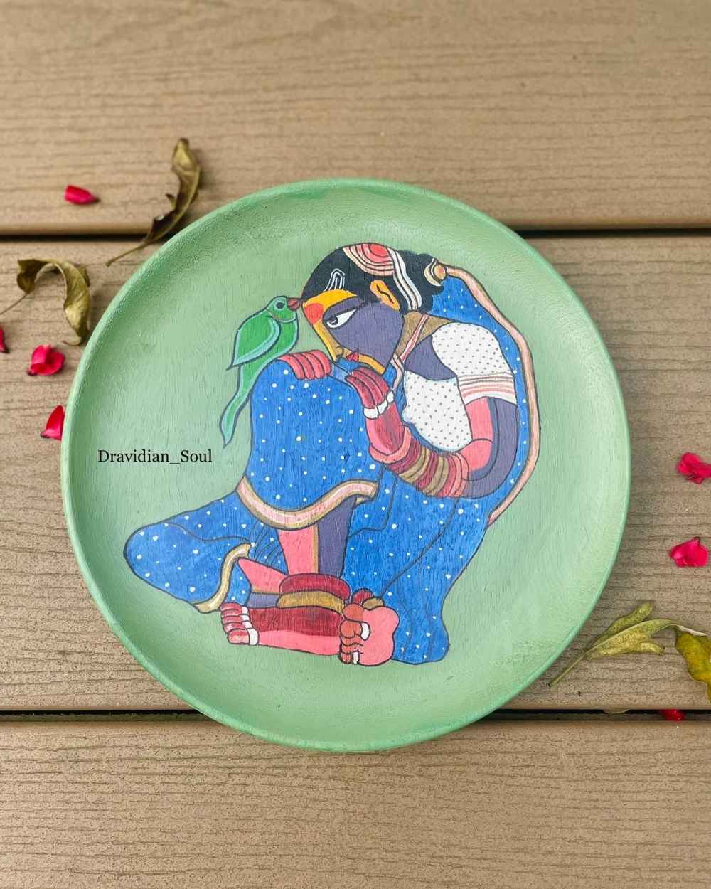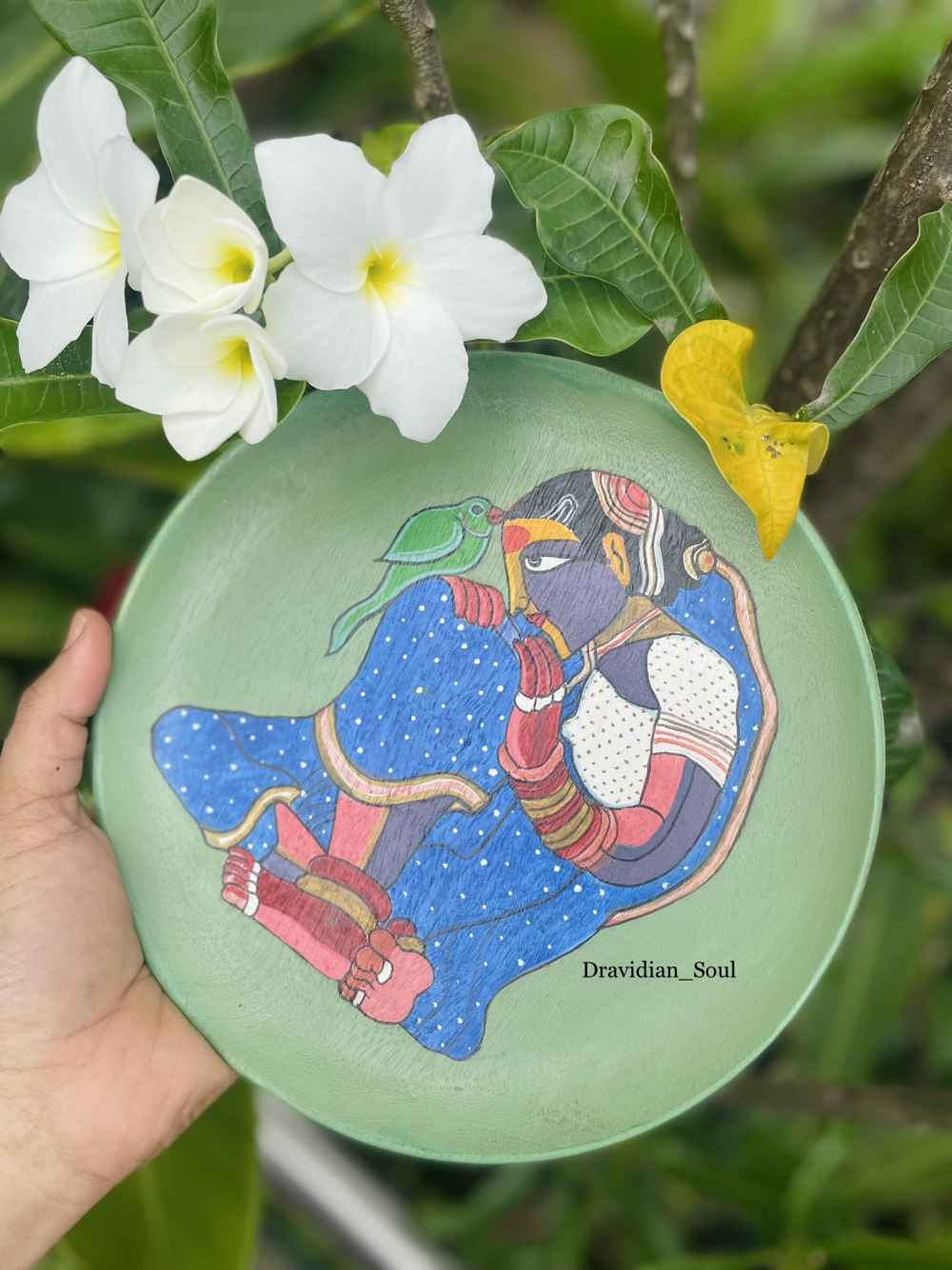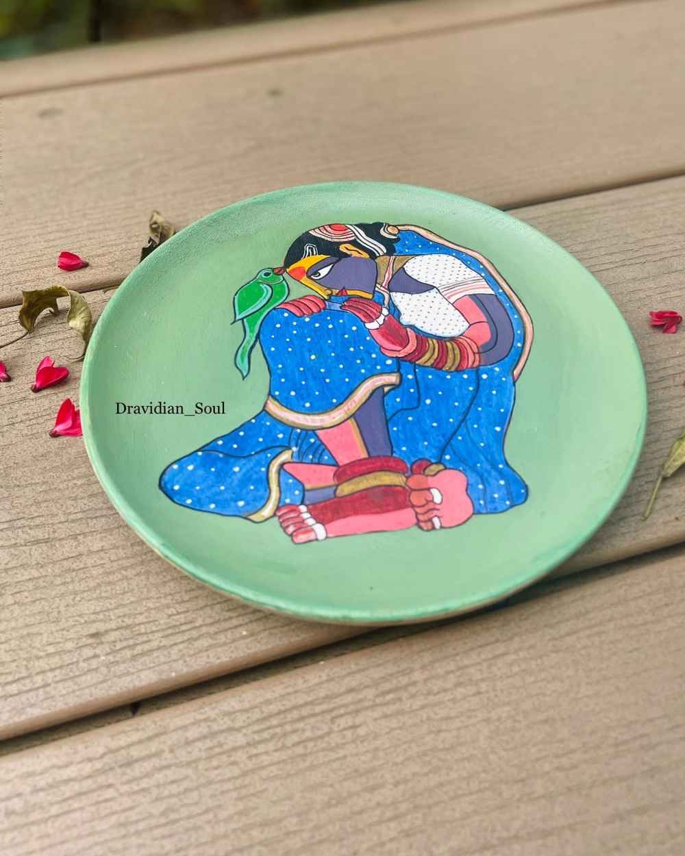 Handpainted wall plate inspired by art of iconic Telengana artist Sri THOTTA VAIKUNTAMGARU, his works always reflect the rawness & strong demeanour of our rural men & dusky voluptuous woman & their traditional folklore in bright bold colours.