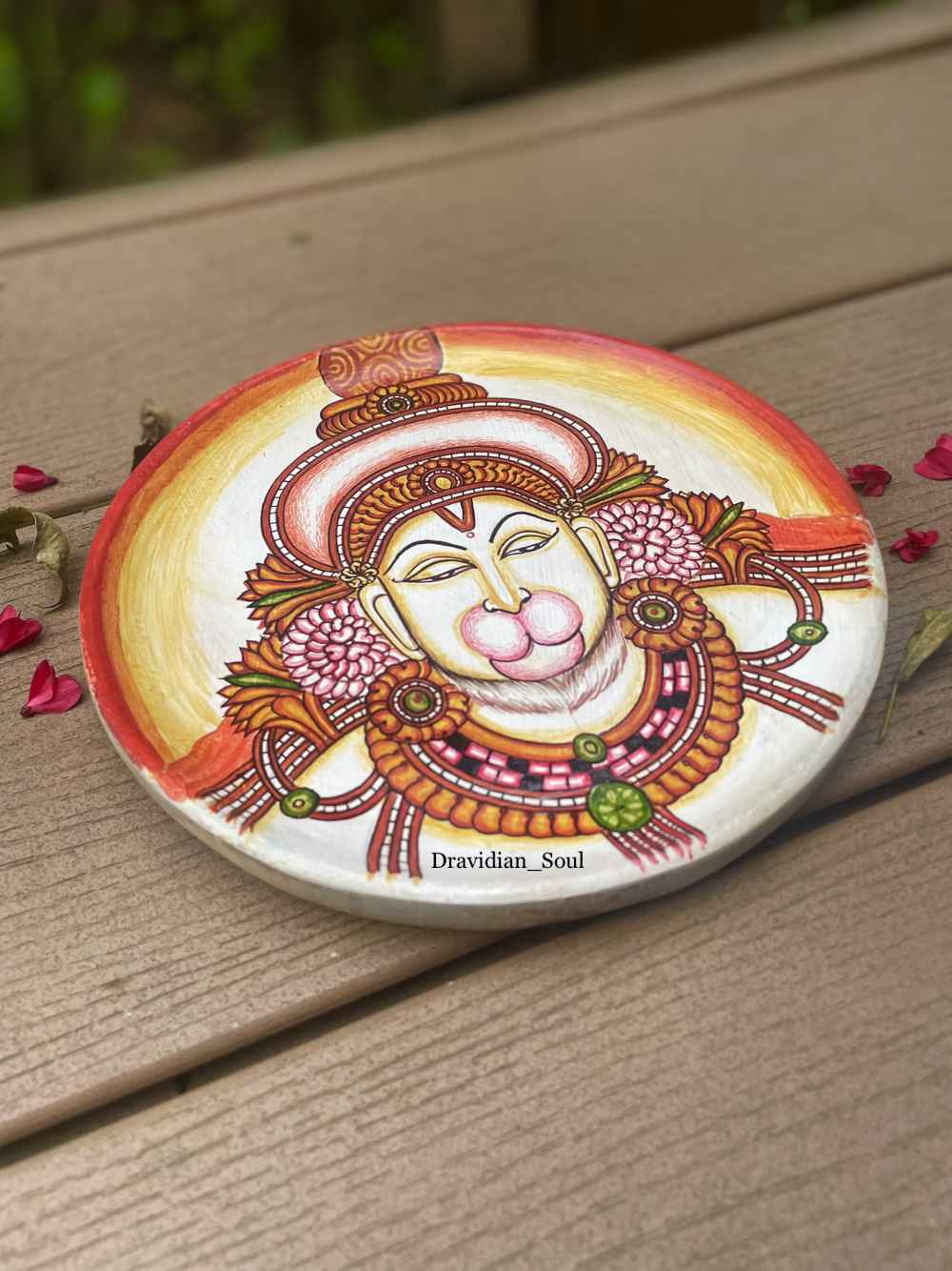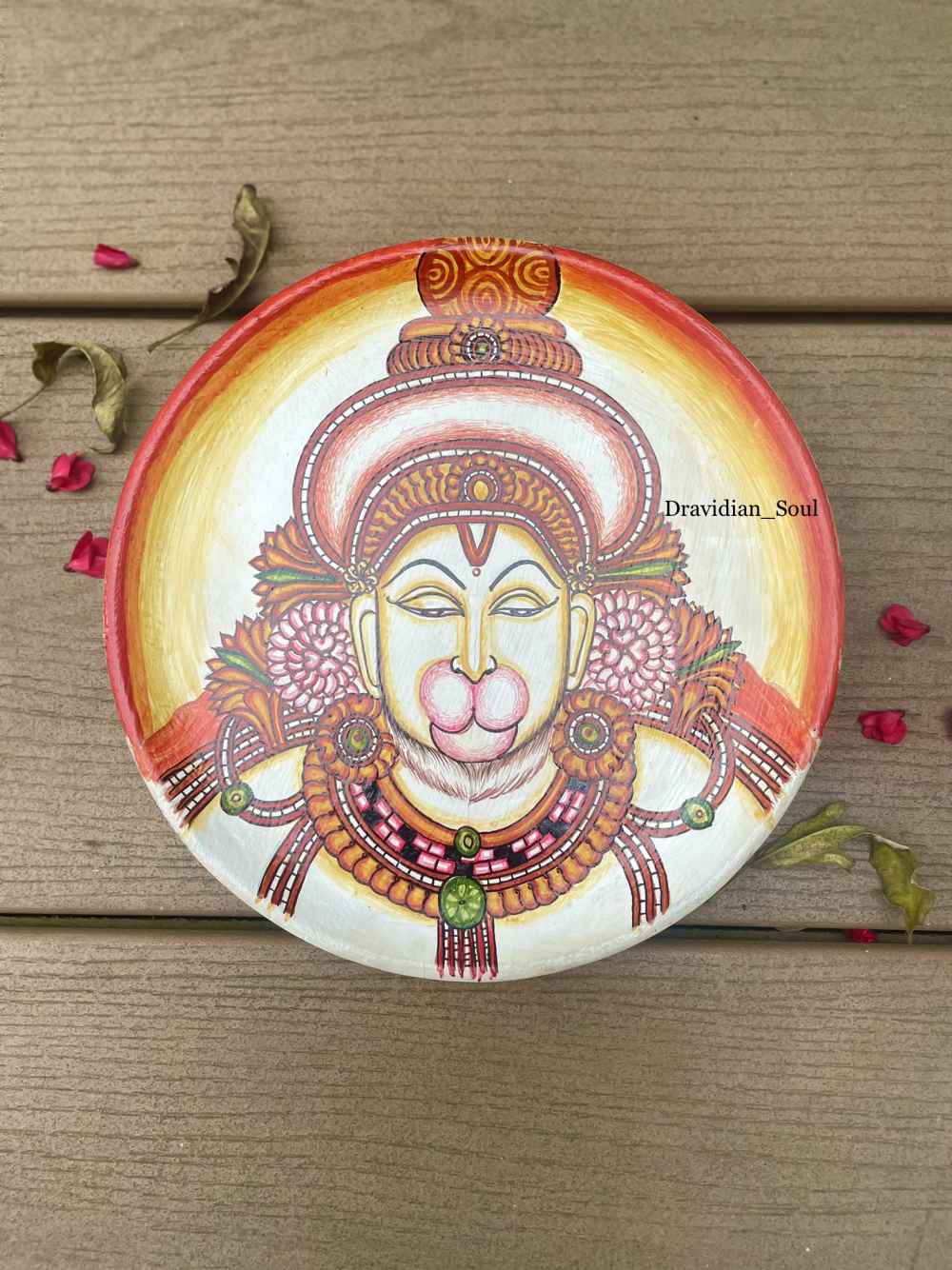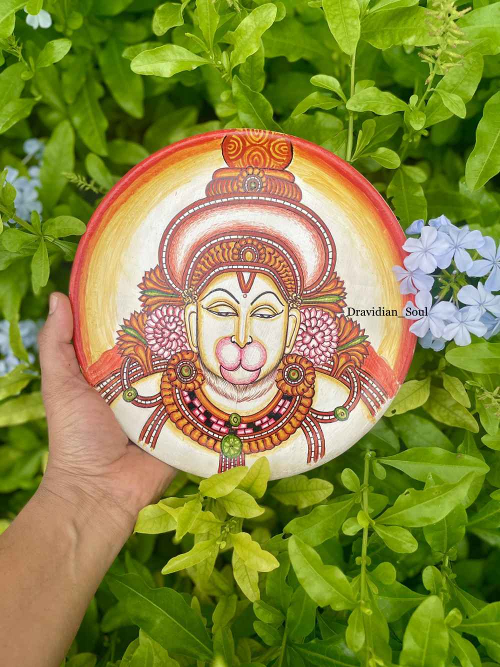 Lord Hanuman Wallplate Handpainted in the Traditional Kerala Mural style. Absolute divine face and the pleasing colours, perfect divine art to add Indian aesthetics to your gallery walls at your beautiful homes.