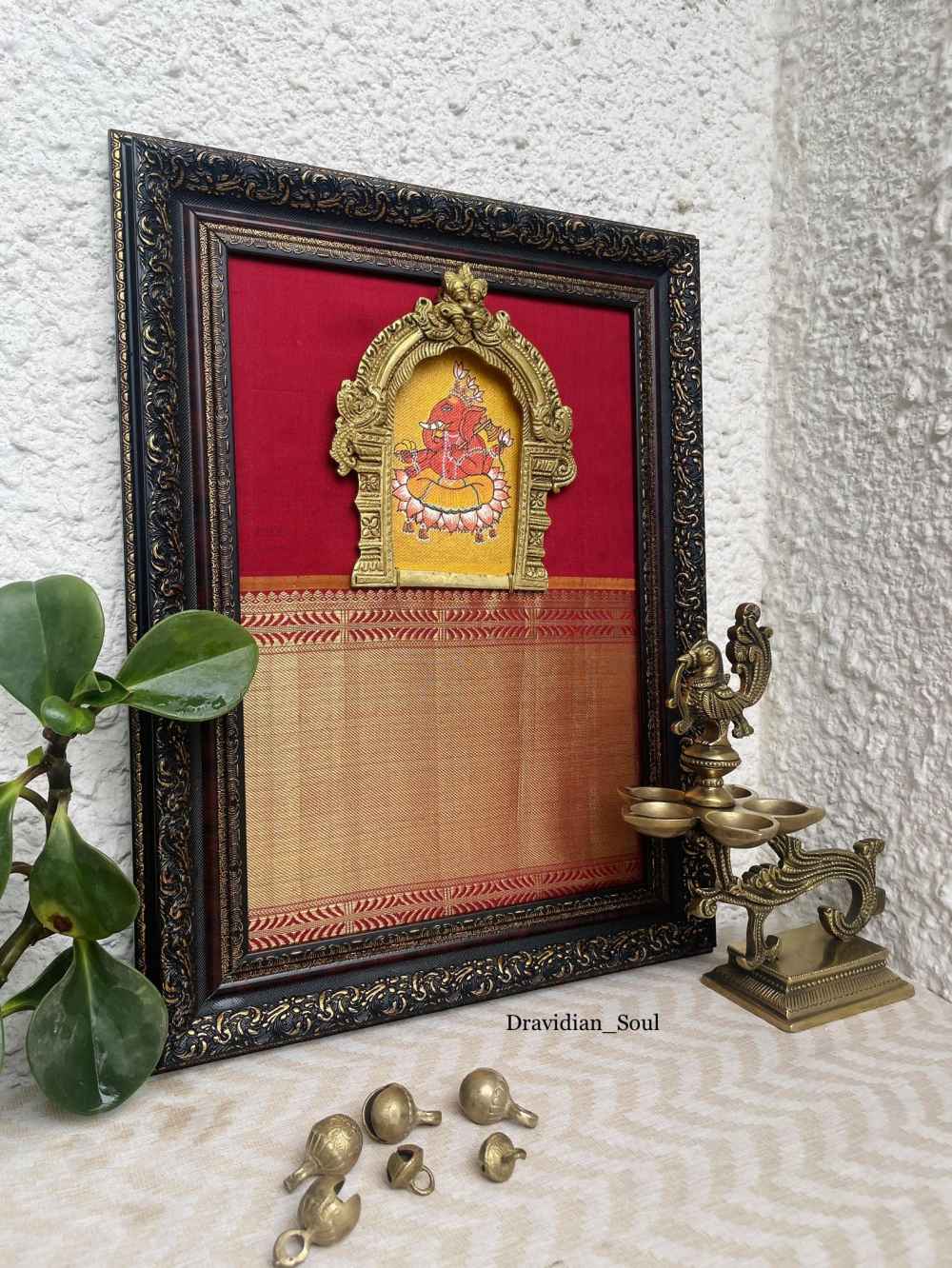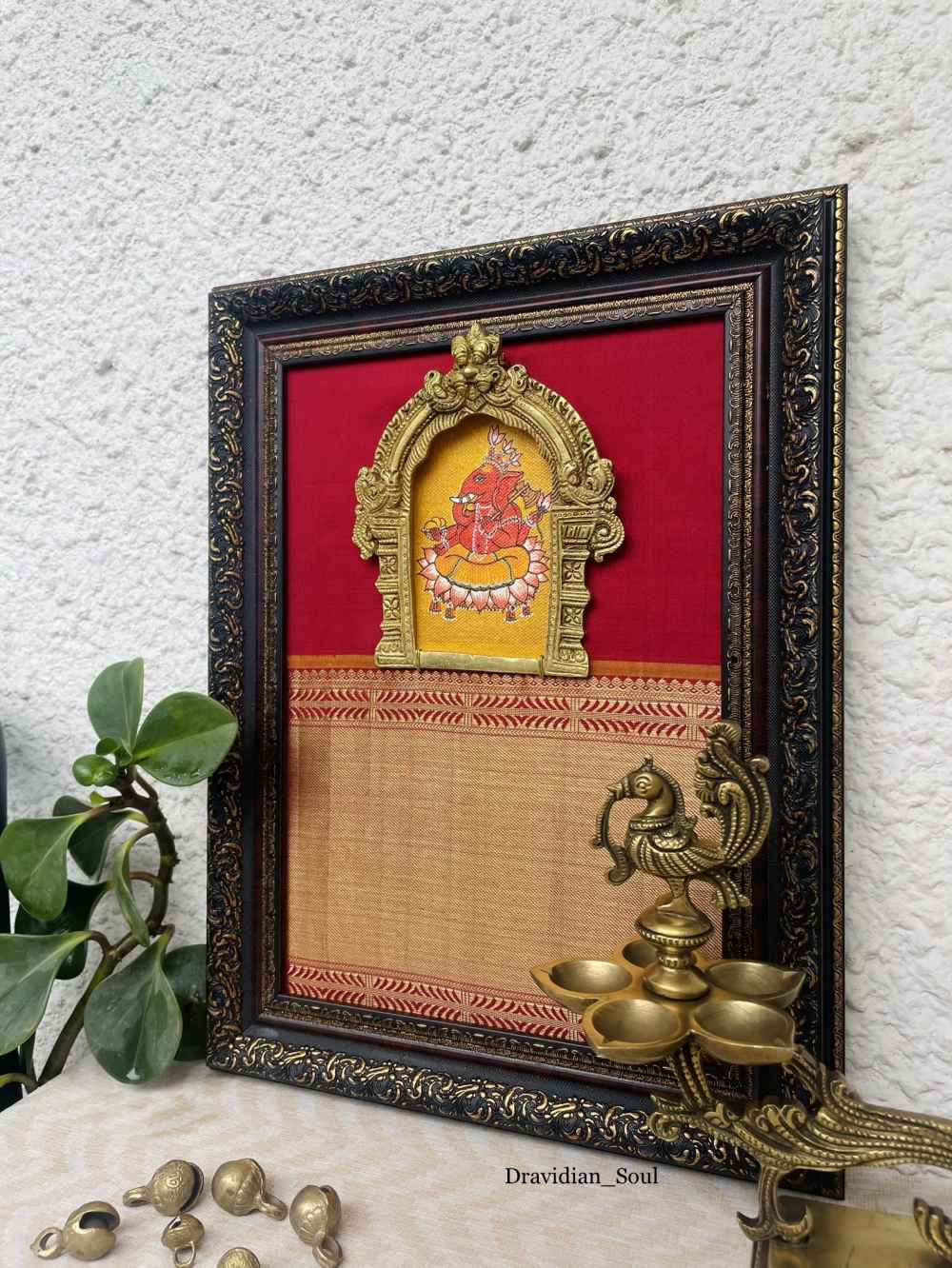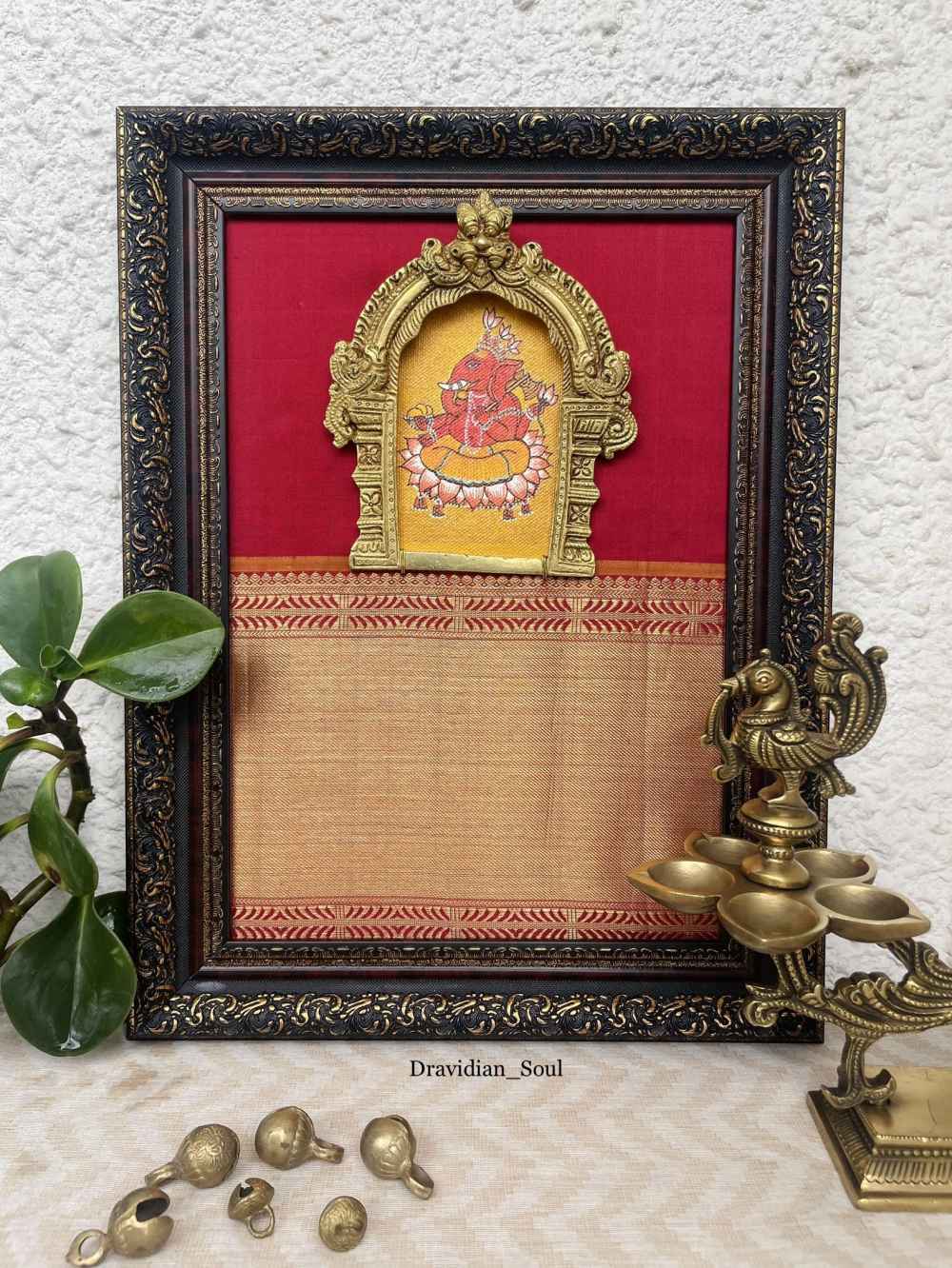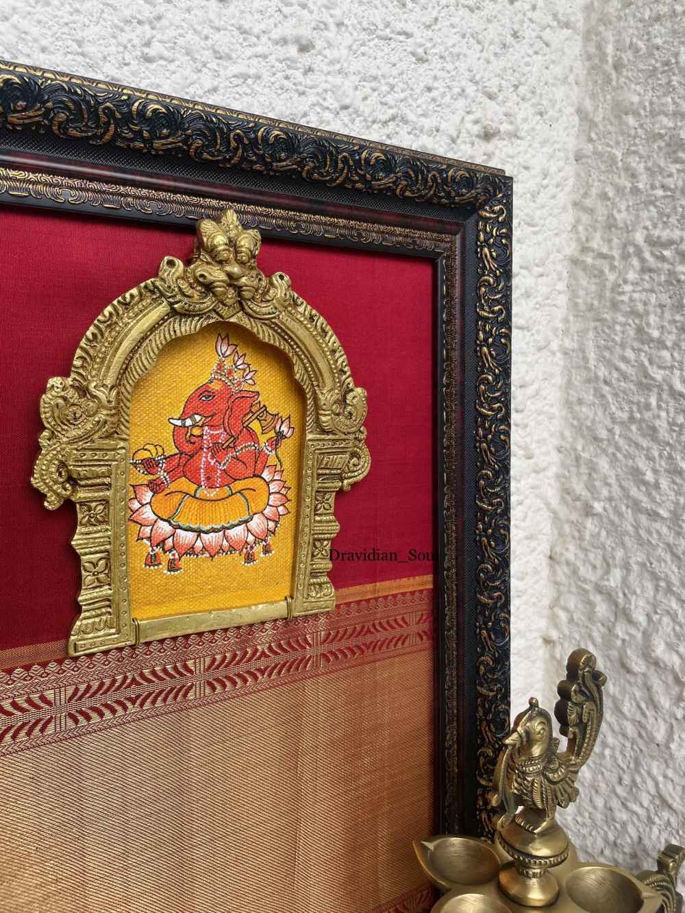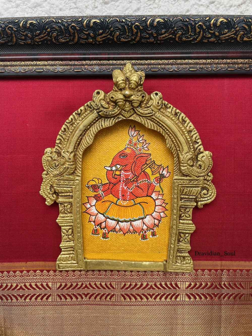Handpainted & Handmade Curated Wall Art of Lord Ganesha/ Ganapathi with Pure Brass Keerthimukha Prabhavali & framed with Pure Kanchivaram silk with broad 6" high pure Zari border fabric in the background. Give your home a traditional & ethnic ... Read More