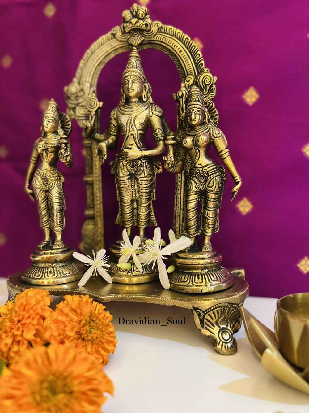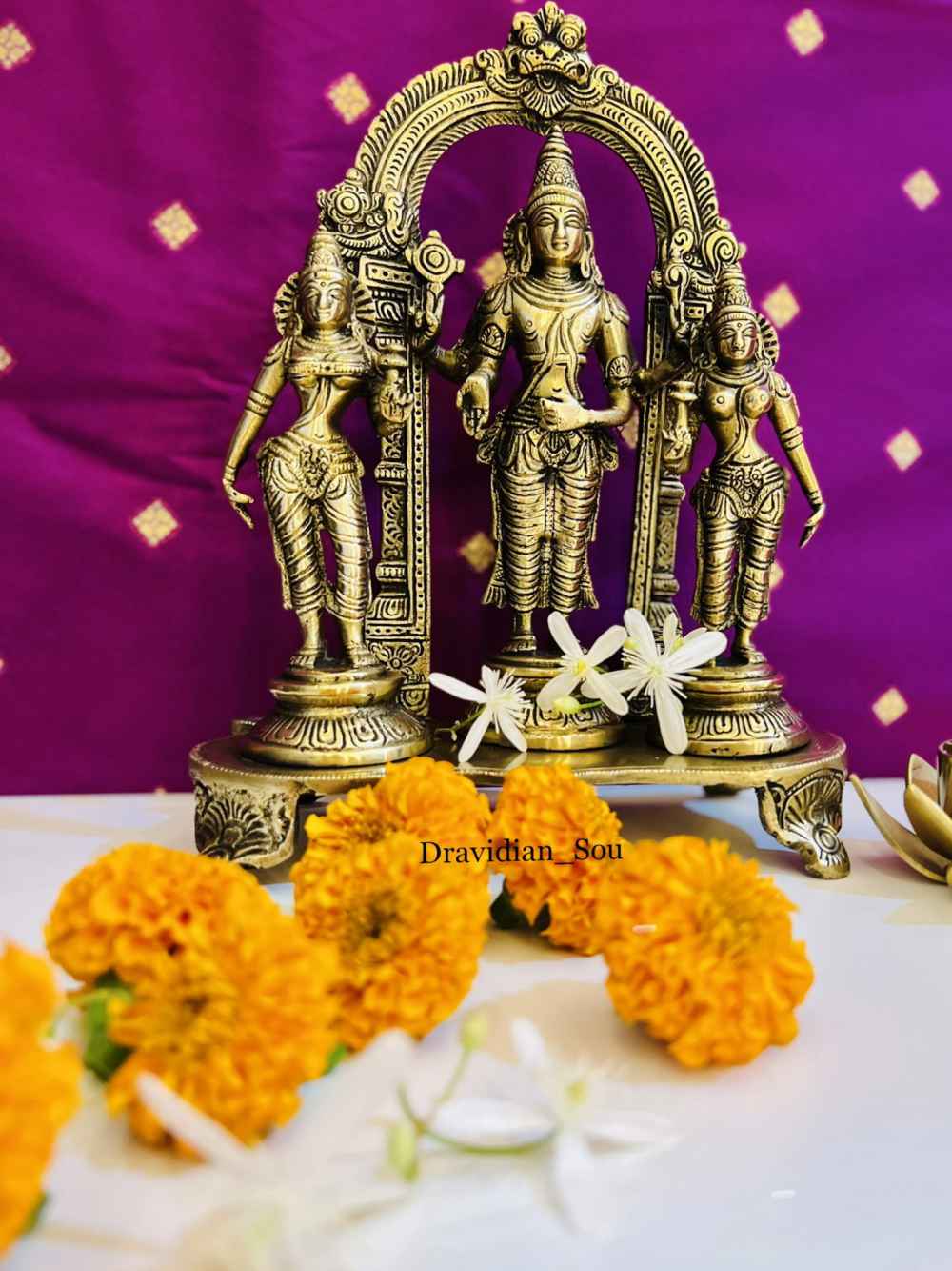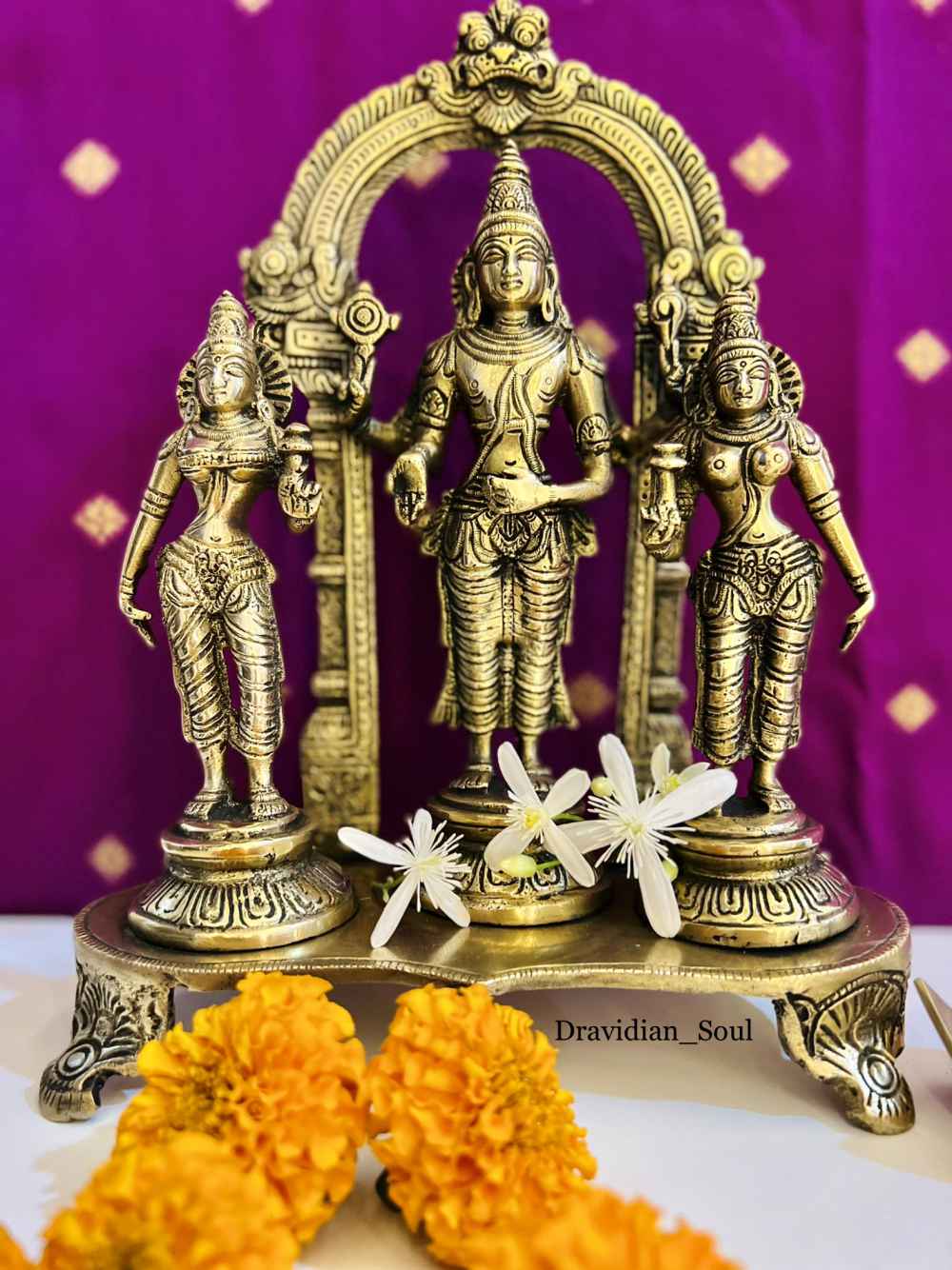 Sri Lakshmi Venkateshwara Swami Bhudevi Sridevi sametha Brass Vigraham with Prabhavali in the background. Can be used for performing puja at your home, or for simply decorating your home with divinity. Venkateshwara is another form of Lord Vishnu ... Read More